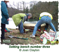 Most of the bench installations were carried out on regular Action Days organised by the Friends group. There is usually one Action Day each month, and the sessions last about two hours (although people aren't expected to stay the whole time unless they want to). Anyone is welcome to attend these Action Days, and all help is gratefully appreciated. All equipment that might be needed is supplied by the Friends, including gloves, spades, rubbish bags, litter picking claws, etc.