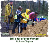 More path construction was carried out in the Woods on the Action Morning held 20th March 2004. Despite the wet weather a determined group of children and grown-ups moved mountains of gravel to create a whole new section of path.